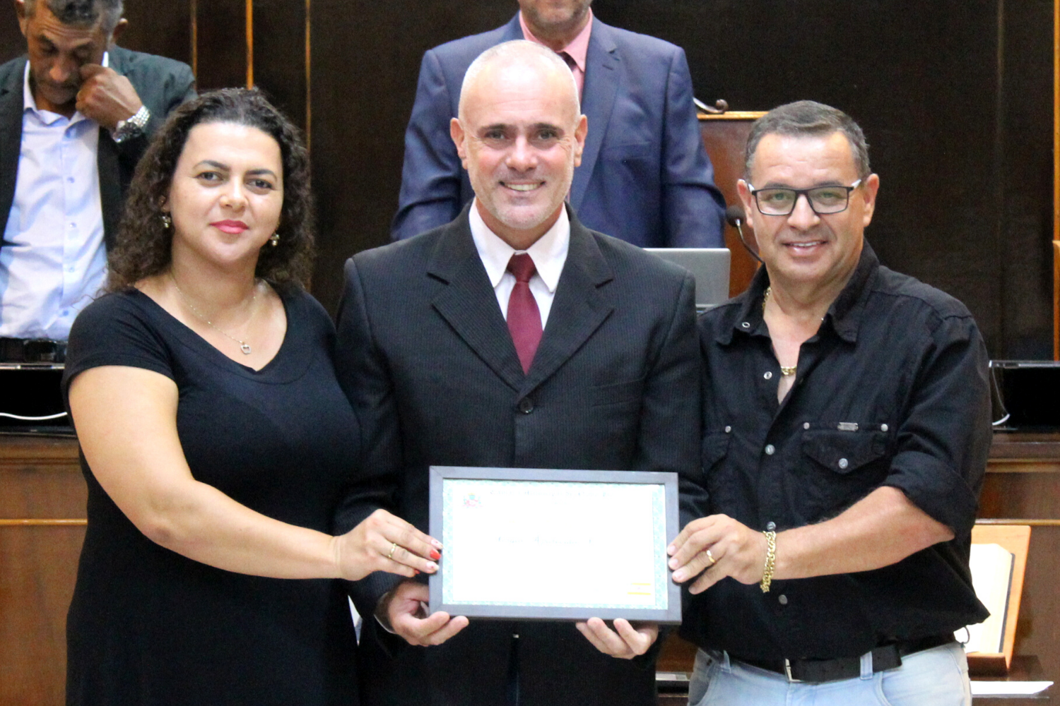 Baixar fotoVereador Kall Rigamonti entrega Moção de Aplausos ao Presidente do Grupo Serseg, Sérgio Ferreira, acompanhado da esposa