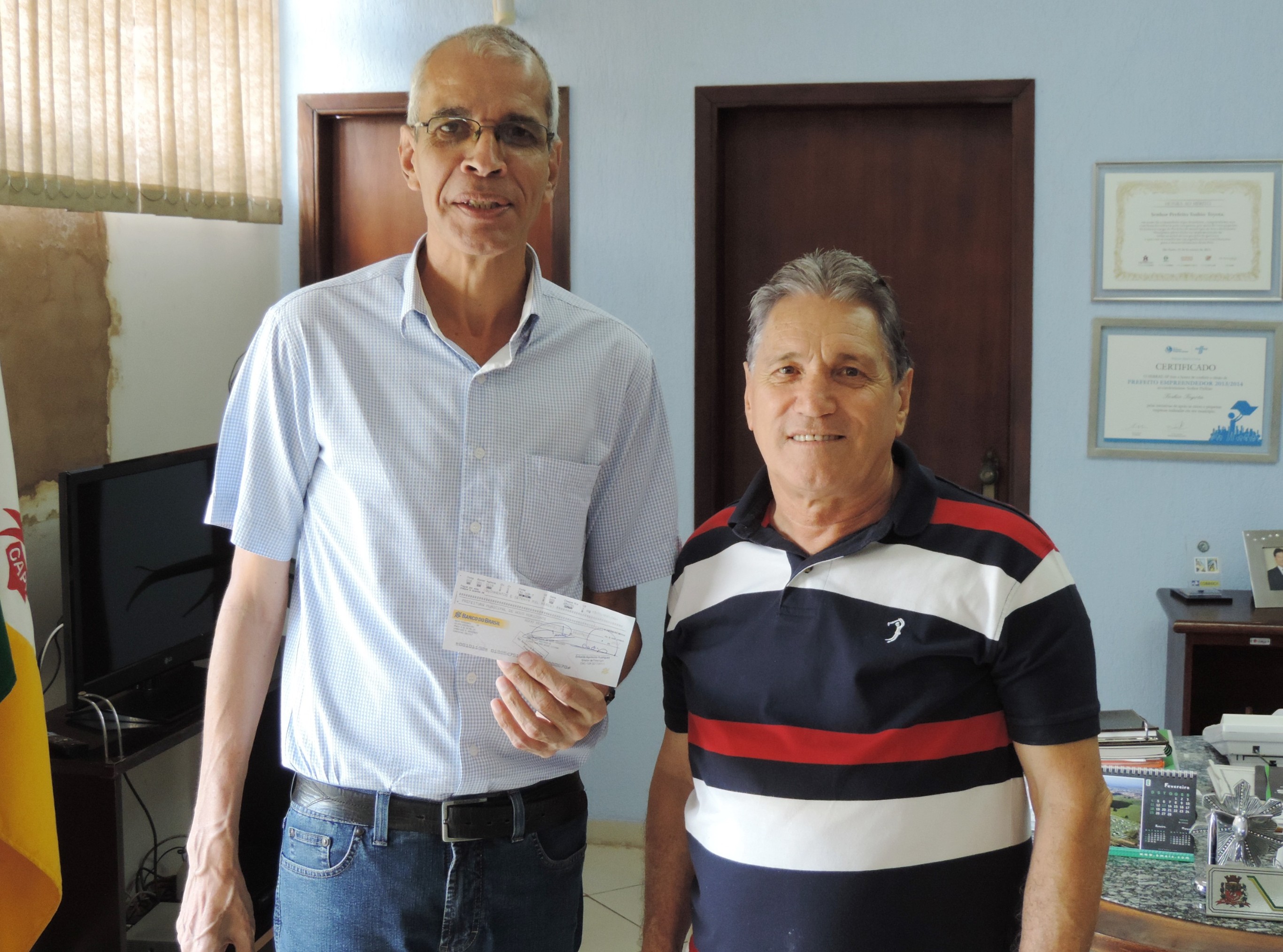 O cheque com o valor da devolução foi entregue ao Diretor de Finanças, Planejamento e Arrecadação, Aparecido Fornazari, e ao Chefe de Gabinete, Carlos Alberto Tupinambá.