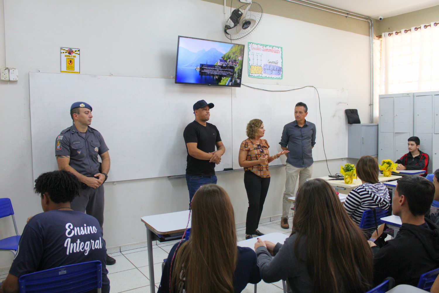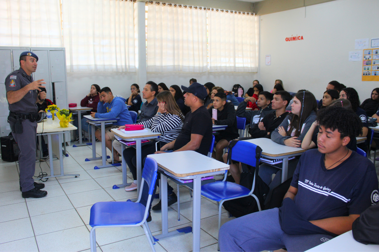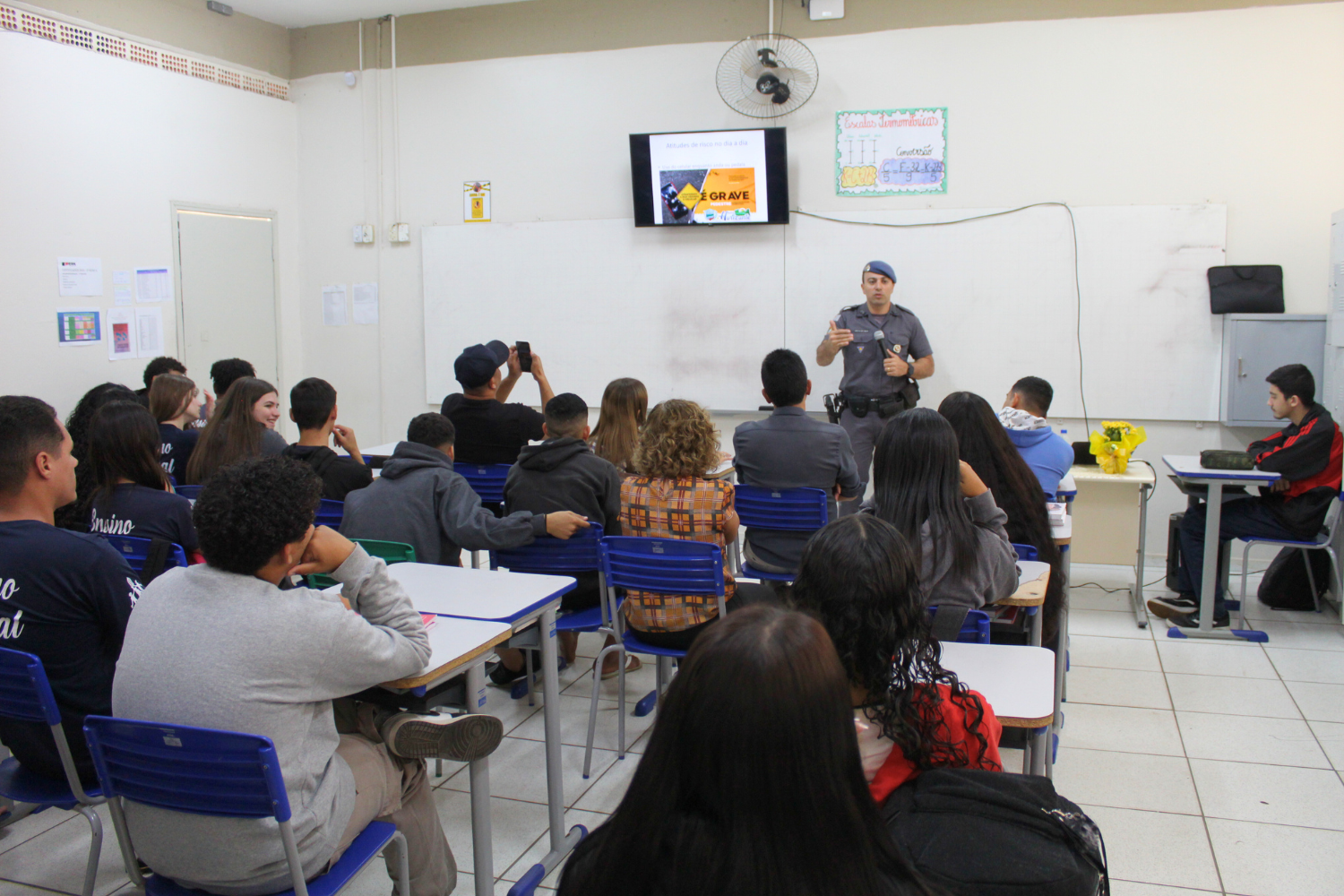 O palestrante foi o Subtenente da Polícia Militar João Henrique Arosti, que apresentou aos jovens uma série de assuntos que permeiam a segurança no trânsito, que envolve pedestres, ciclistas, motociclistas e motoristas e o papel de cada um para um trânsito mais seguro; destacou a questão do controle emocional em situações de estresse no trânsito; falou sobre imprudências, distrações e negligências; uso de celular e bebidas alcoólicas; o uso de bicicletas, autopropelidos e patinetes elétricos; entre outros.