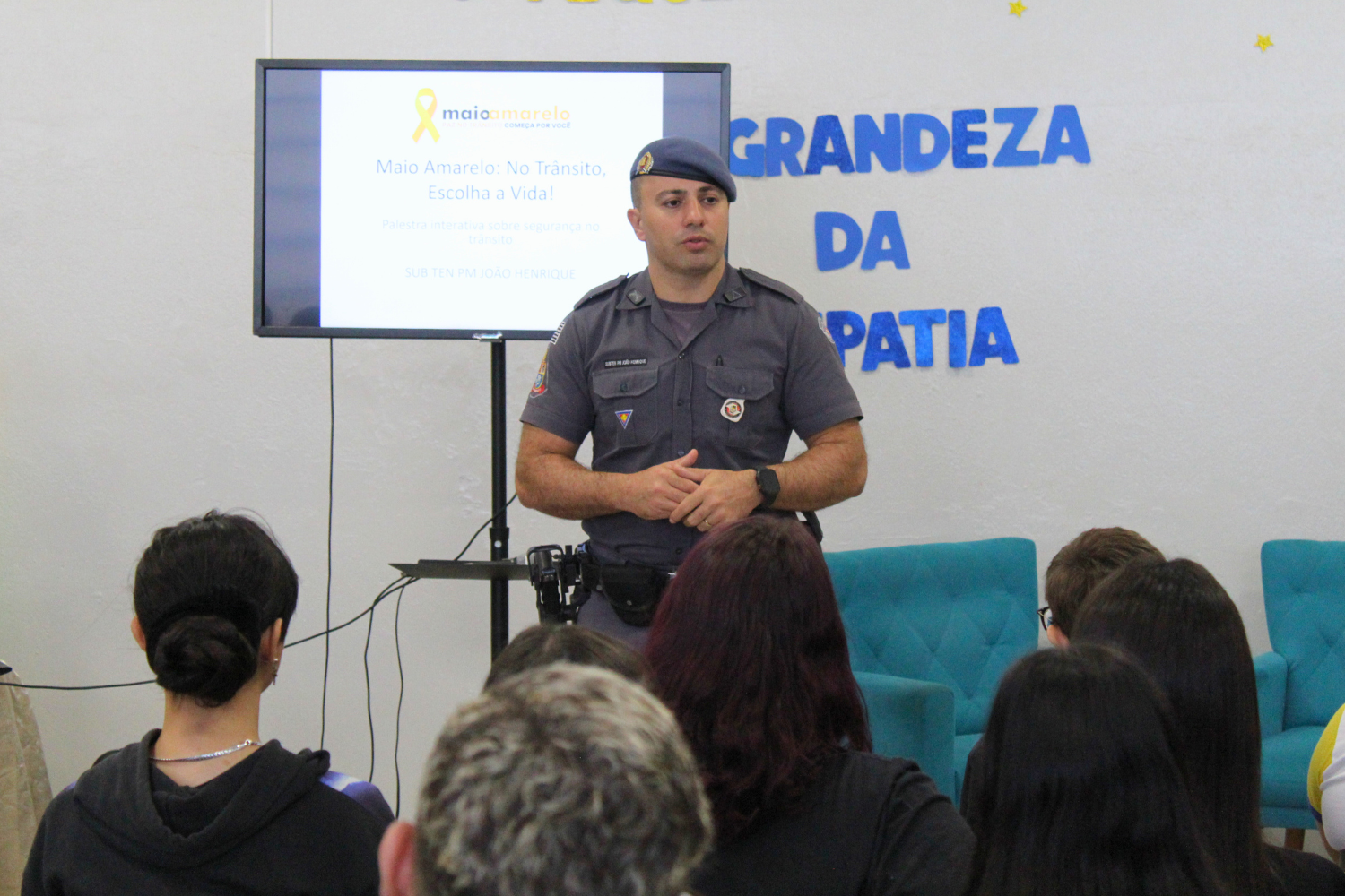 O palestrante Subtenente da Polícia Militar João Henrique Arosti mais uma vez expôs aos alunos vários assuntos que envolvem a segurança no trânsito de uma forma muito dinâmica, prática e com uma linguagem bastante acessível aos jovens.