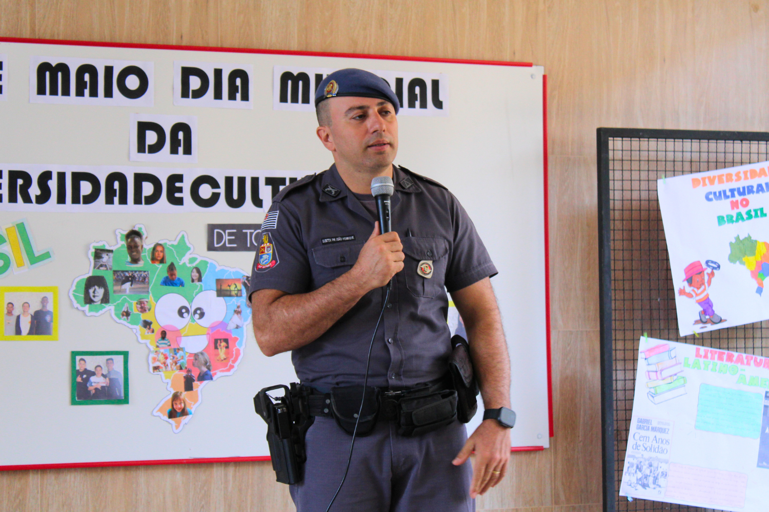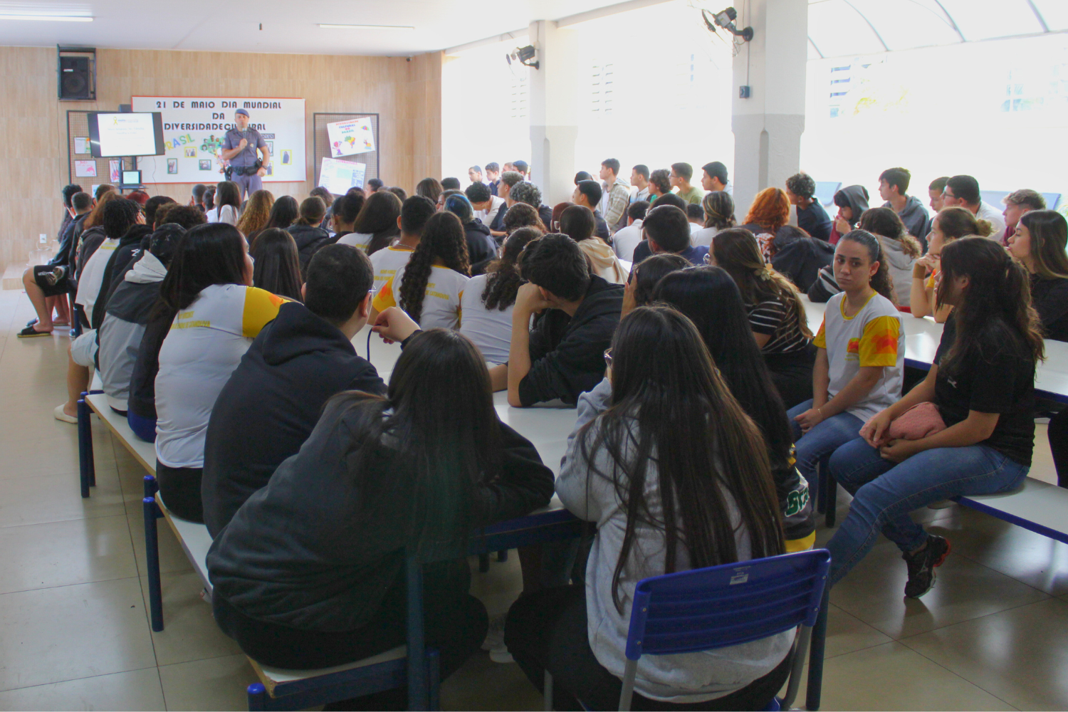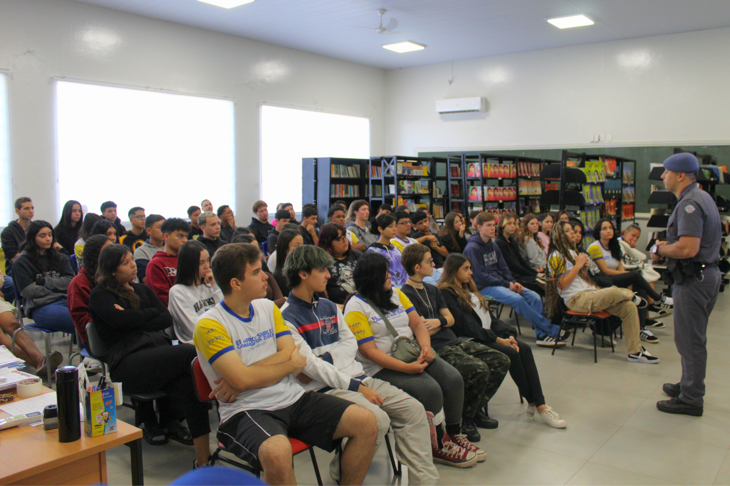 O palestrante Subtenente da Polícia Militar João Henrique Arosti mais uma vez expôs aos alunos vários assuntos que envolvem a segurança no trânsito de uma forma muito dinâmica, prática e com uma linguagem bastante acessível aos jovens.